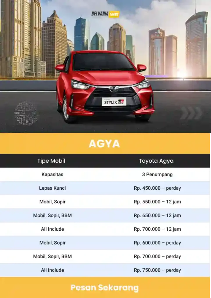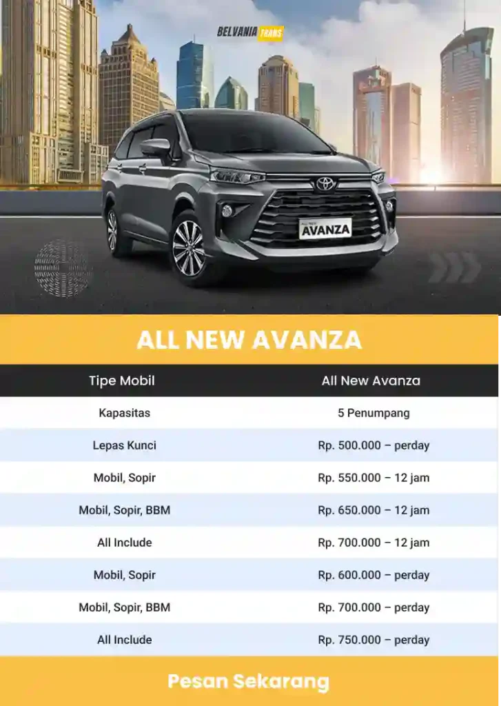 Jelajahi keindahan Purbalingga dengan mudah bersama Belvania Trans Rental Mobil! Nikmati kebebasan perjalanan tanpa terikat jadwal transportasi umum atau biaya taksi online yang membengkak. Dengan armada lengkap, harga bersaing, dan layanan profesional, rental mobil Purbalingga kami siap mendukung perjalanan bisnis, liburan keluarga, maupun kunjungan pribadi Anda.